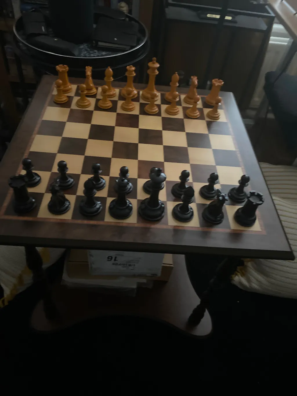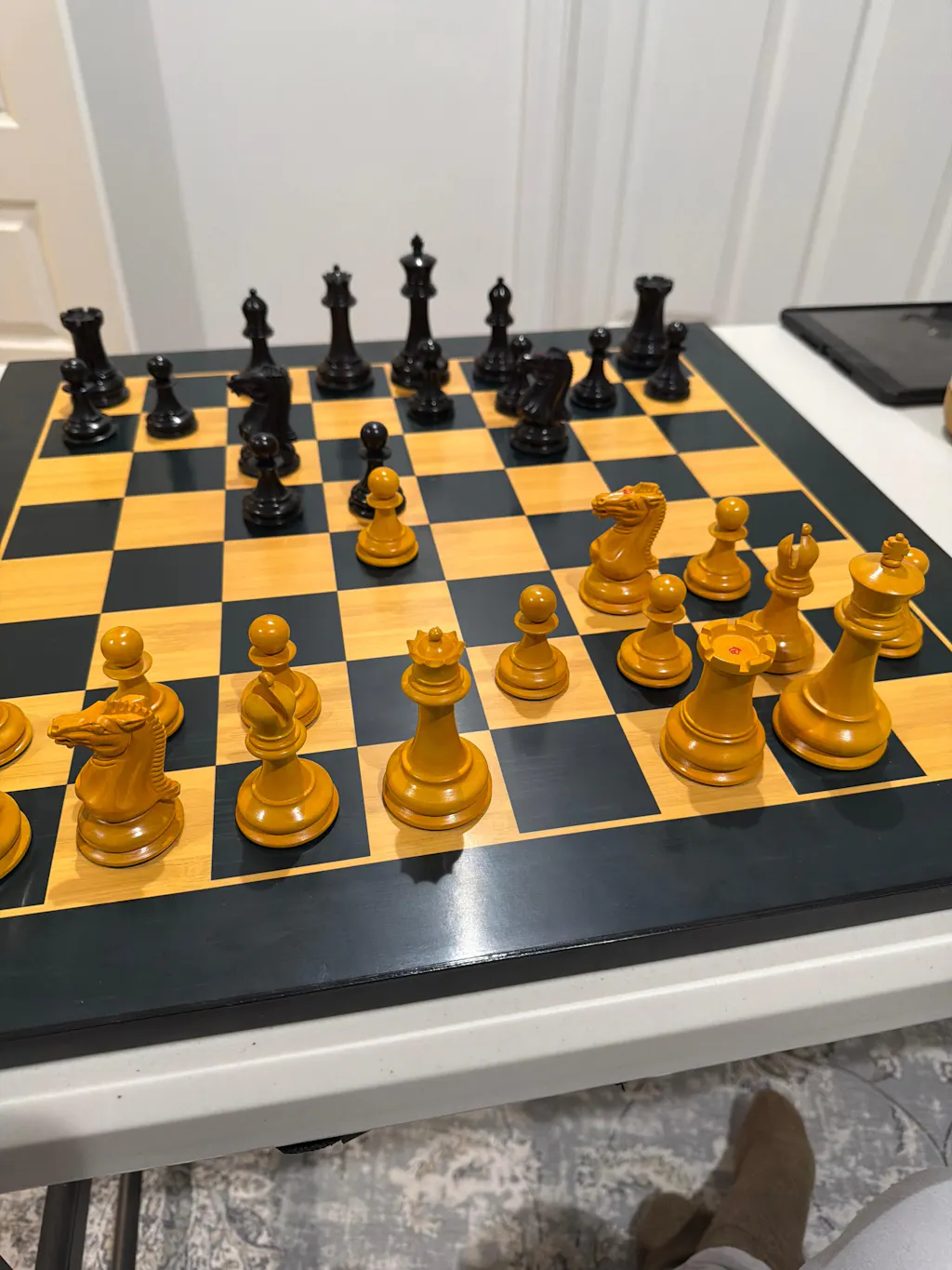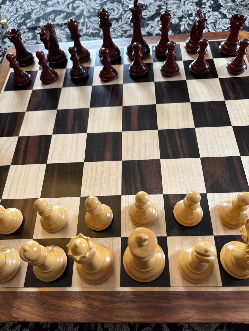 For my birthday, I was utterly spoilt by my wife and sons by these chess pieces (3,9 inch Heritage Series Staunton) and (ebony and buxus) chessboard. What beauty and craftsmanship, stunning!