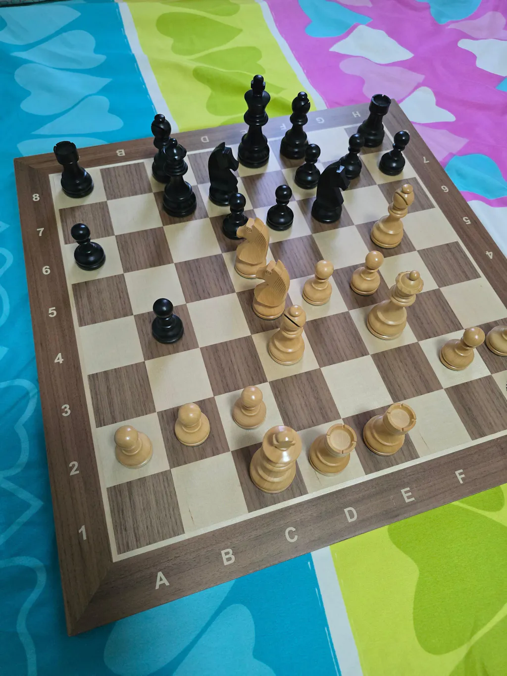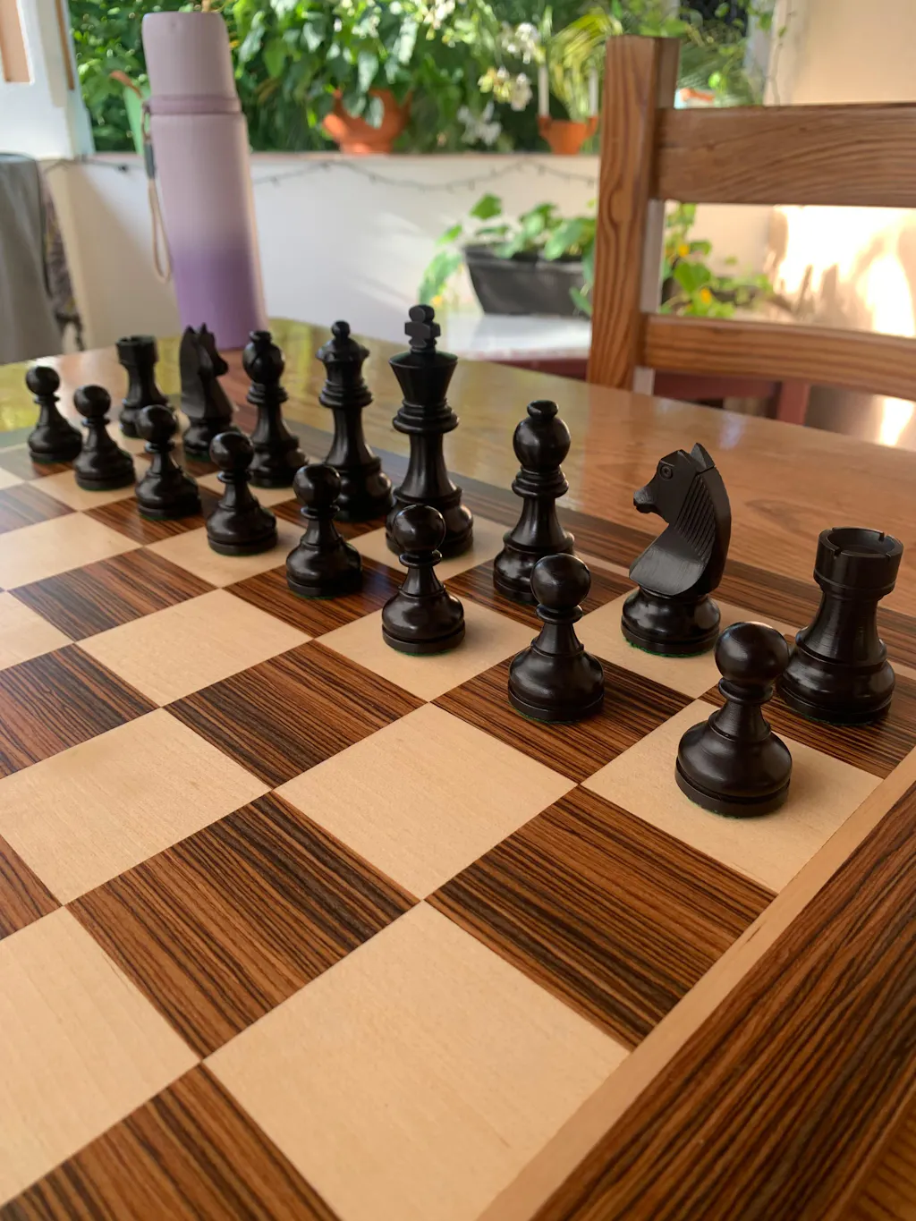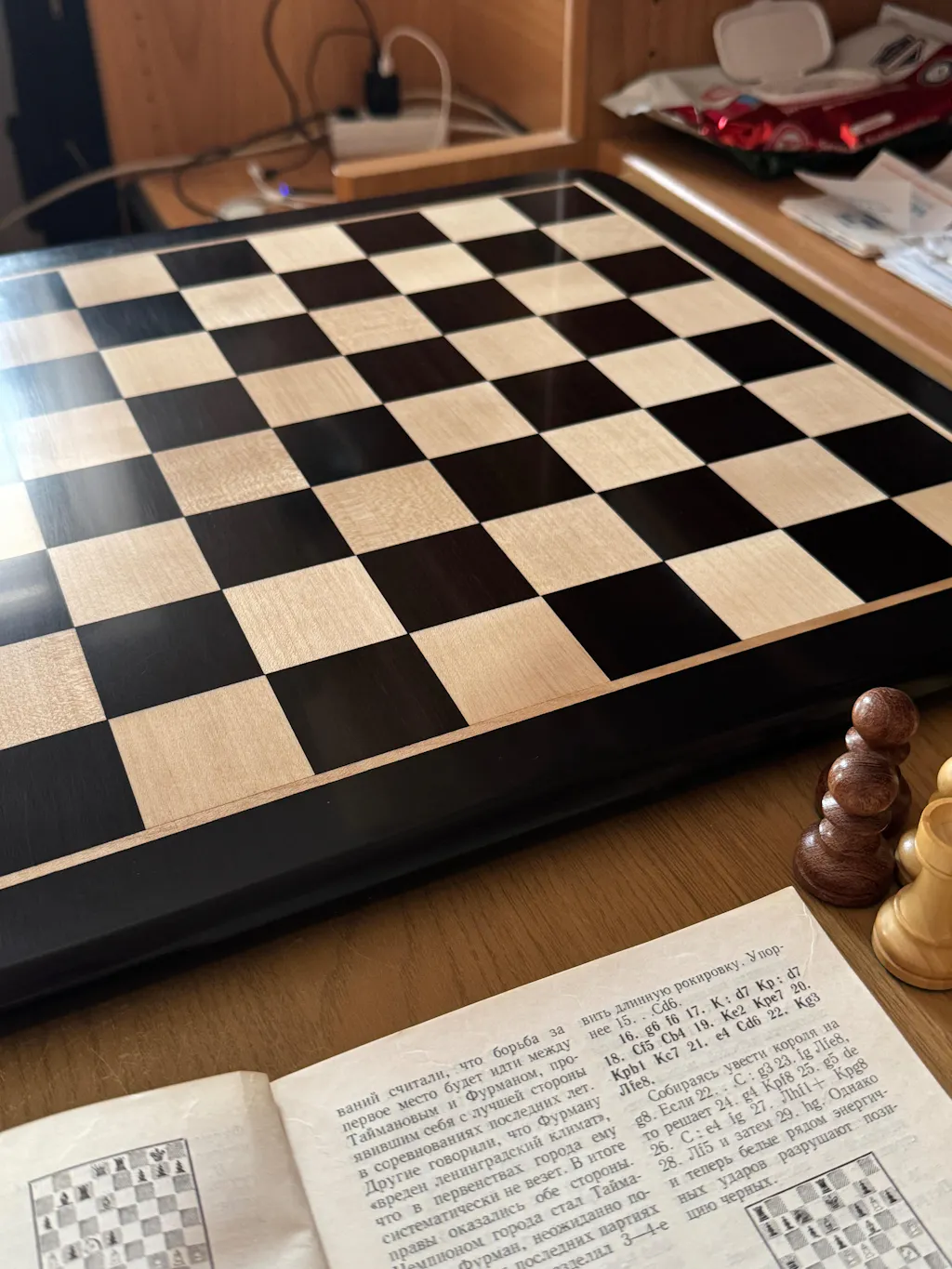 For my birthday, I was utterly spoilt by my wife and sons by these chess pieces (3,9 inch Heritage Series Staunton) and (ebony and buxus) chessboard. What beauty and craftsmanship, stunning!