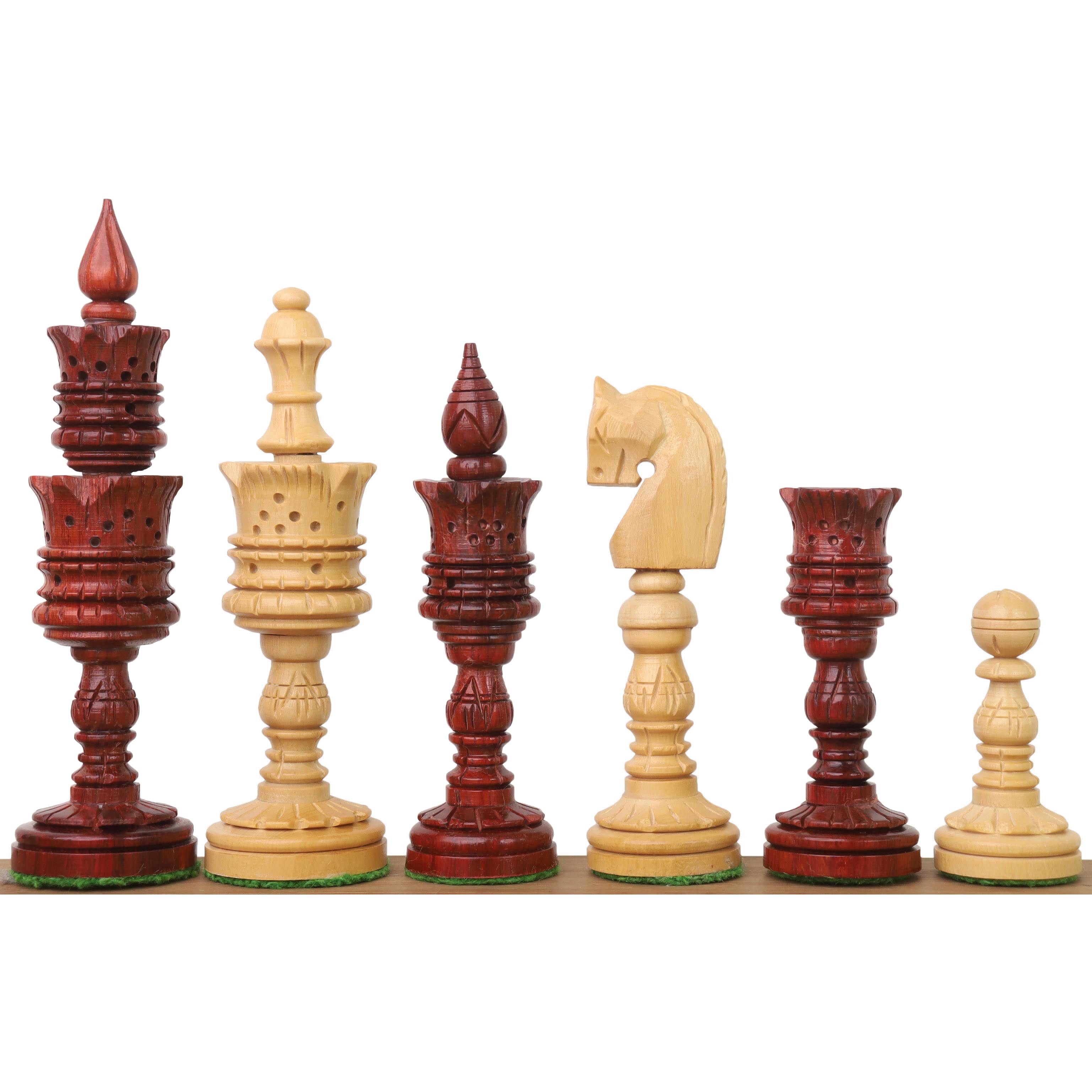 Unsere Schachfiguren der Lotus-Serie sind ein unverwechselbares und optisch auffallendes Schachfiguren-Set, das für sein einzigartiges, von der Lotusblume inspiriertes Design bekannt ist. Diese Schachfiguren sind aus hochwertigem Knospenpalisander und Buchsbaum gefertigt.
