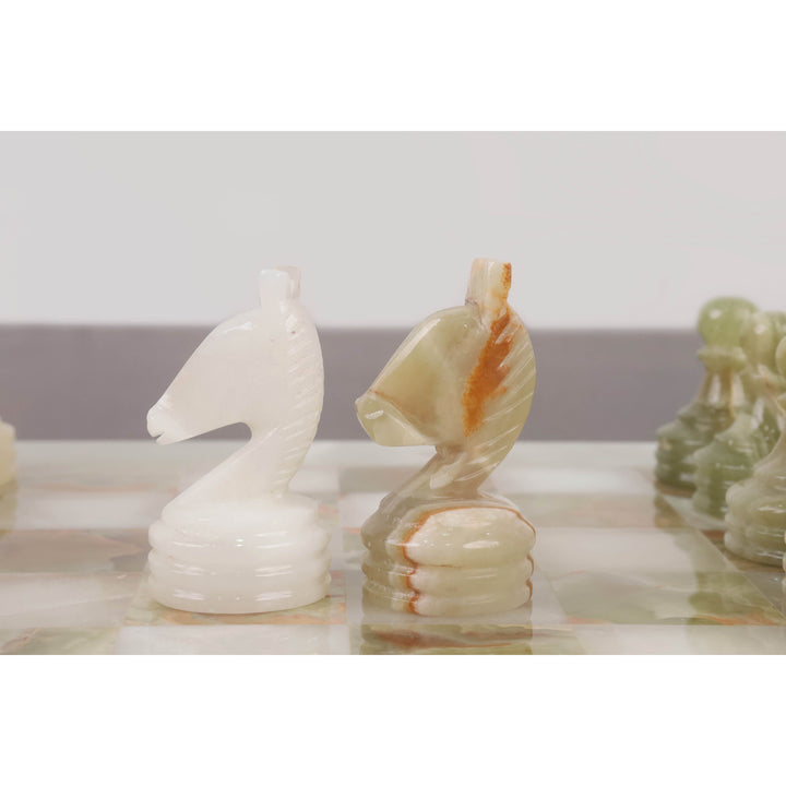 This elegant marble chess set is a testament to the exceptional craftsmanship of the skilled artisans at Royal Chess Mall. Handcrafted using basic carving tools, the set features chess pieces sculpted from rich Onyx Marble and pristine White Stone, giving it a unique and captivating appearance.