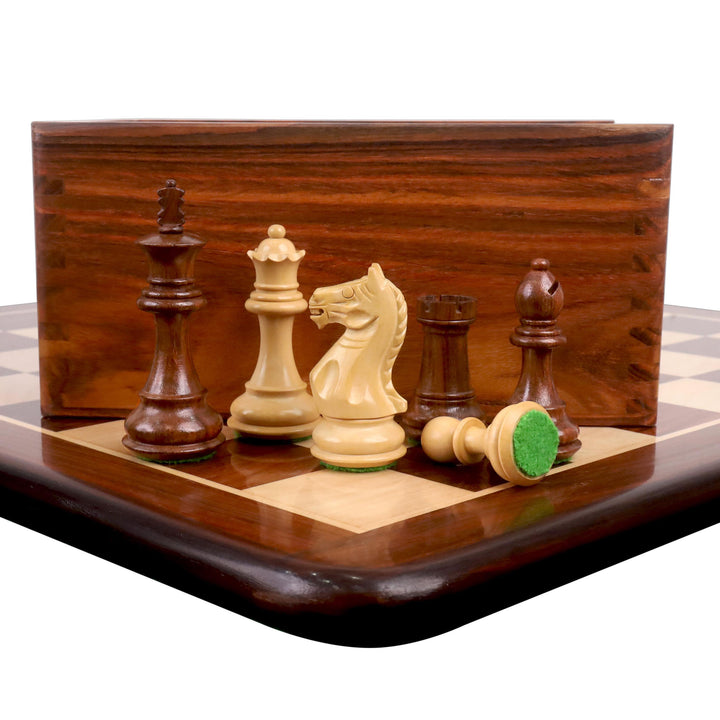 The Fierce Knight Staunton Series is a premium chess set, featuring 3.5" King-size chess pieces made from Golden Rosewood and Boxwood, ideal for tournaments or casual play. Paired with a meticulously crafted Golden Rosewood and Maple wood chess board, it offers brilliant symmetry and elegance for players of all levels. The set includes a sliding-style storage box with a durable finger joint bond, designed to securely store chess pieces up to 4 inches tall. Combining beauty, functionality, and craftsmanship, this set is perfect for chess enthusiasts