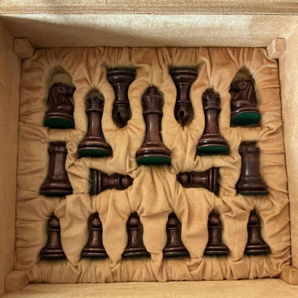 Our Leatherette coffer box is well suited for storing Chessmen of (3.5 to 4.1 inch king size). The inner side of the box has been felted with a beautiful felt. The cloth is soft and prevents any damage to the chess pieces. Also the trays have been crafted so that they are able to store chessmen of varying heights and base diameters.