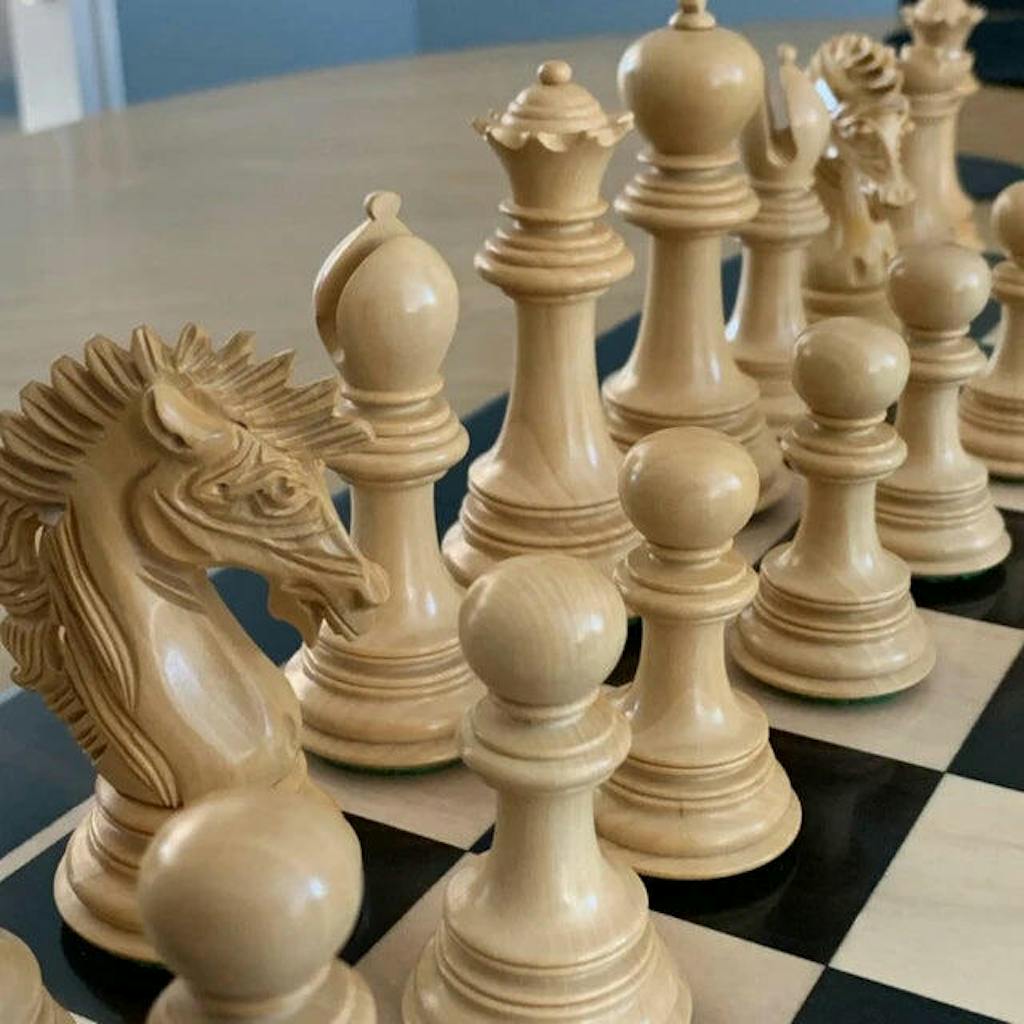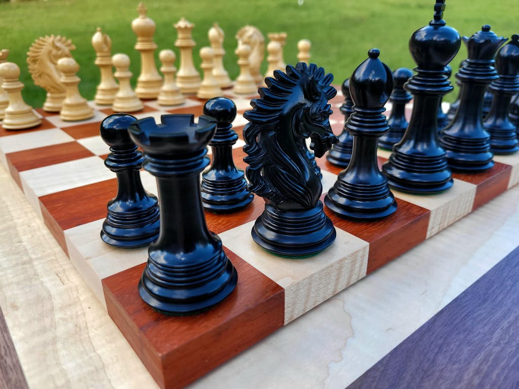 The 4.6" Mogul Staunton Luxury Chess Set is a true expression of artistry and grandeur. Hand-carved from exquisite Ebony Wood, each piece radiates richness and refined craftsmanship.