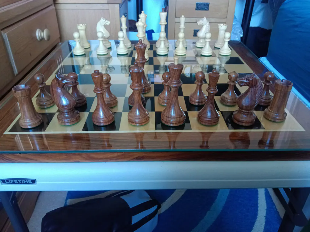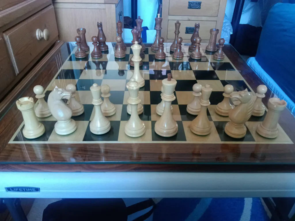 Roy I received this chess set last week having purchased a slightly imperfect set and I must admit that they are slightly imperfect but however please don't let this put you off as they are only minor and don't detract what a fantastic chess pieces they are and how beautiful they look and feel when in us this is about the tenth plus item I've purchased from royal chess mall and they never fail to disappoint unfortunately the pictures don't do this fantastic chess set justice but they will give you a good idea the chess board used is a ebony and maple with a sheesham boarder and this board has 60 mm size squares this was also purchased from royal chess five years ago