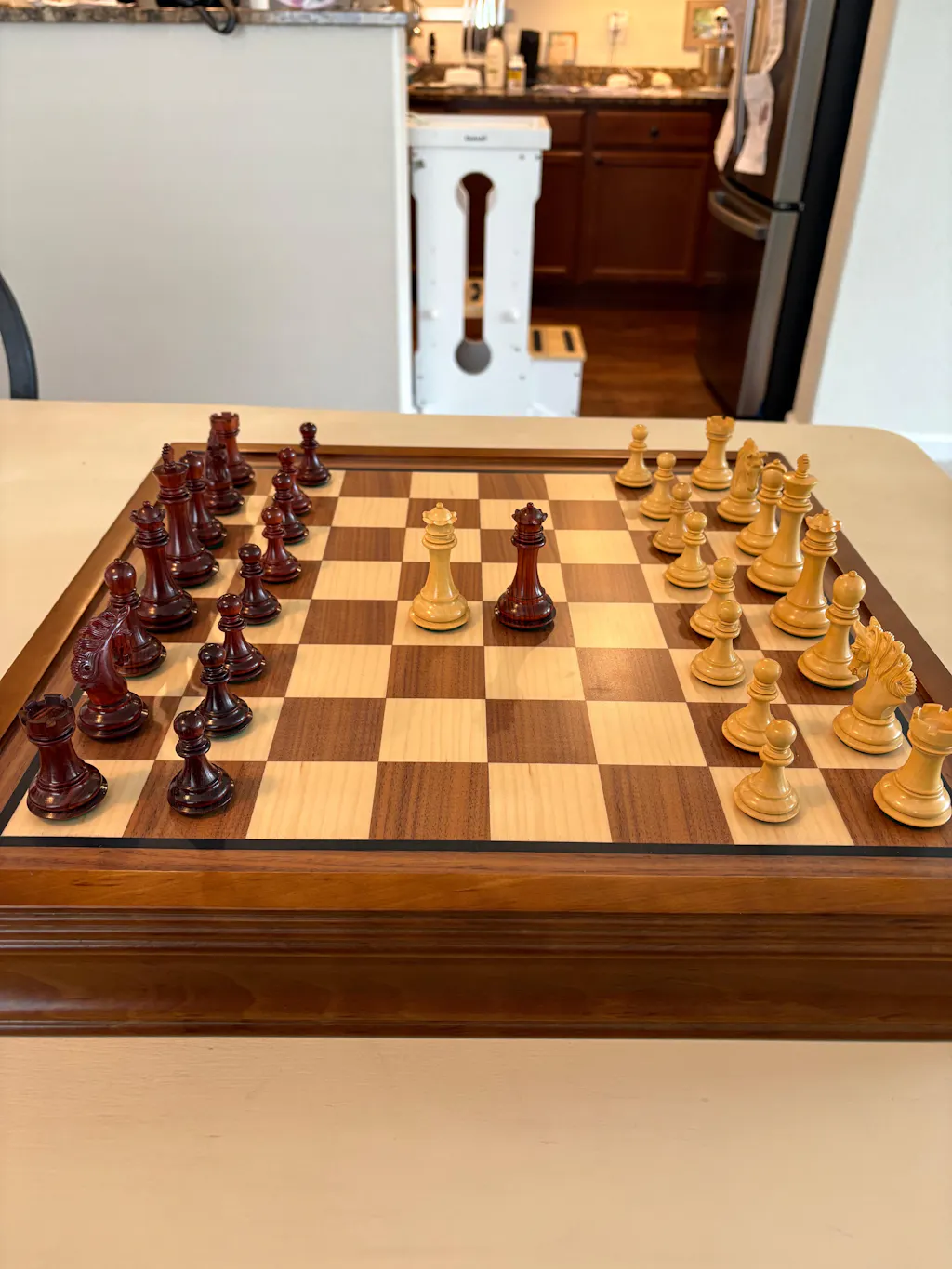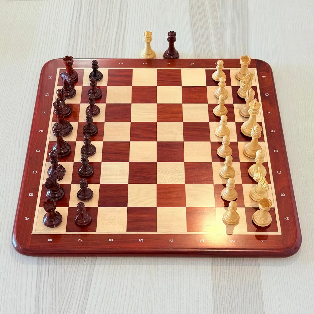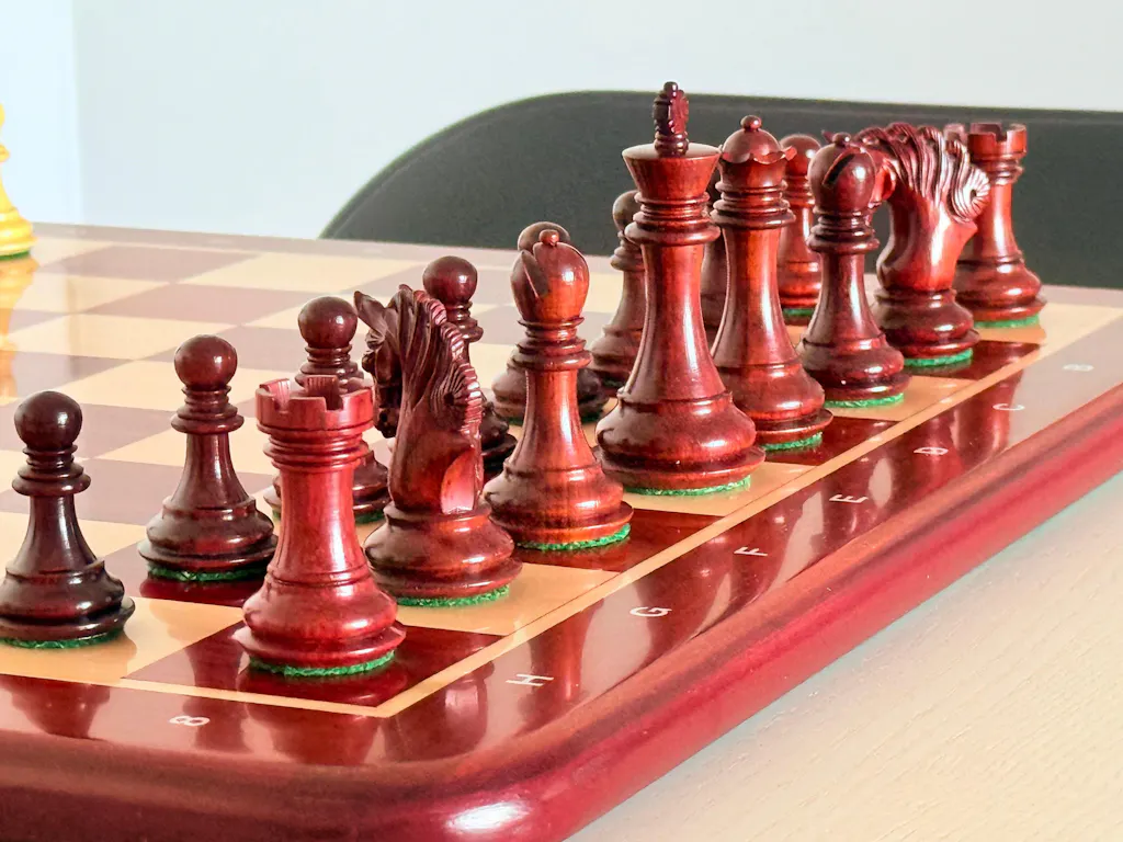 Despite being on the smaller side, they have a very good weight to them and don't feel unstable. Very beautifully crafted and the colour is stunning. This smaller set fits well on the 19" matching bud rosewood board. They give you spare queens for pawn promotion. Very happy.