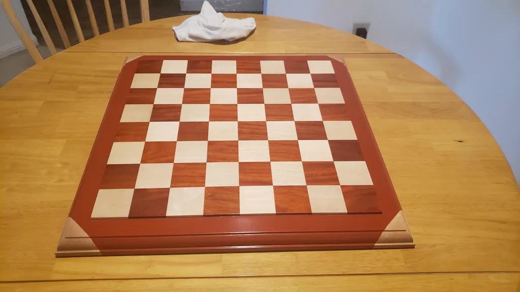 This chessboard is the epitome of elegance and precision, brought to life by the skilled hands of master artisans. Their dedication to perfection is evident in the board's impeccable geometrical symmetry, making it not just a game board, but a work of art. The unique construction design features contrasting maple wood sections at the corners, adding a touch of sophistication and flair to its overall appearance.