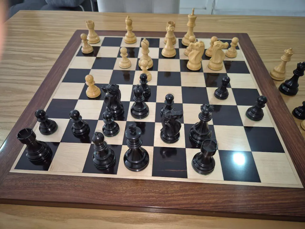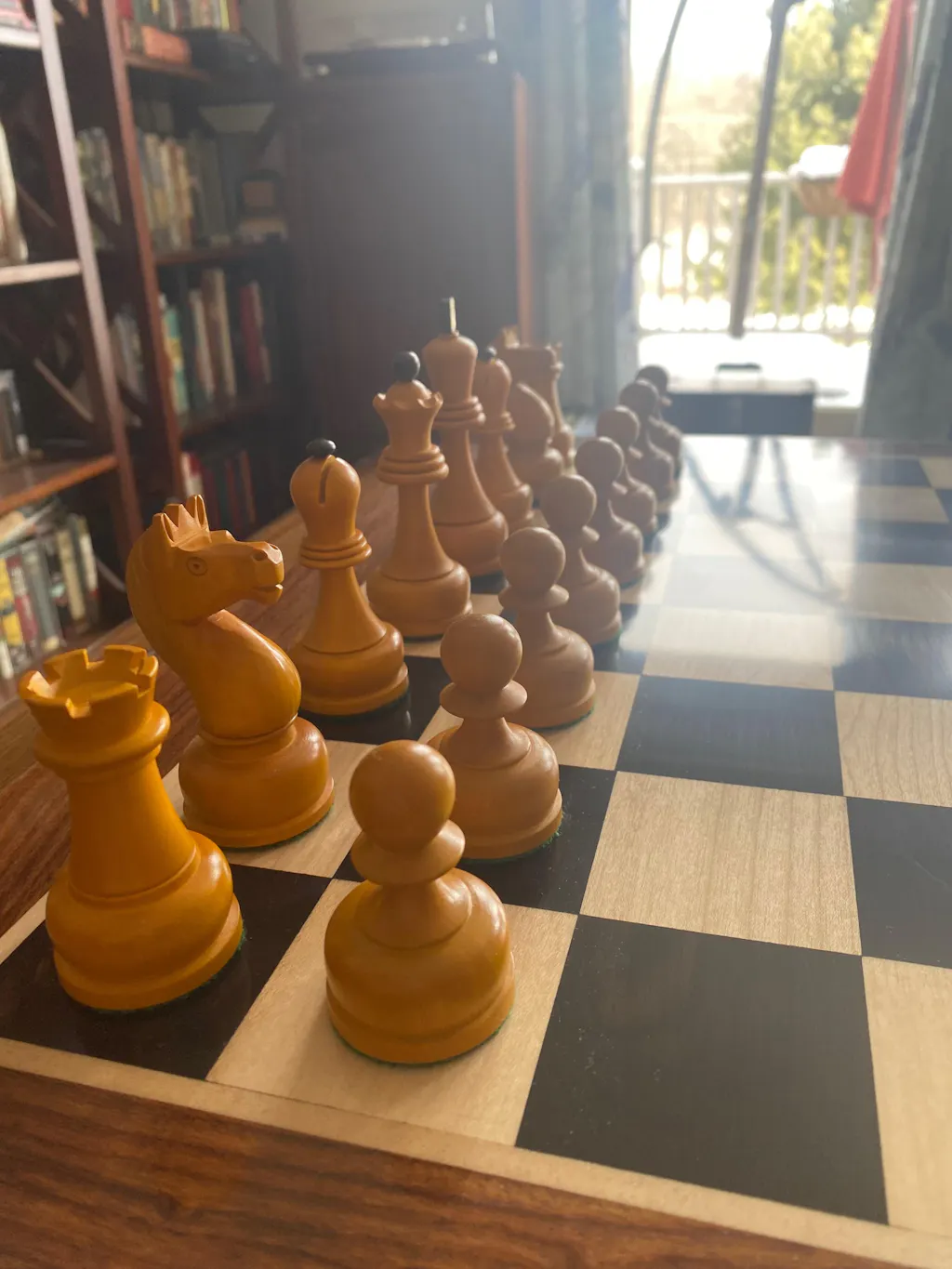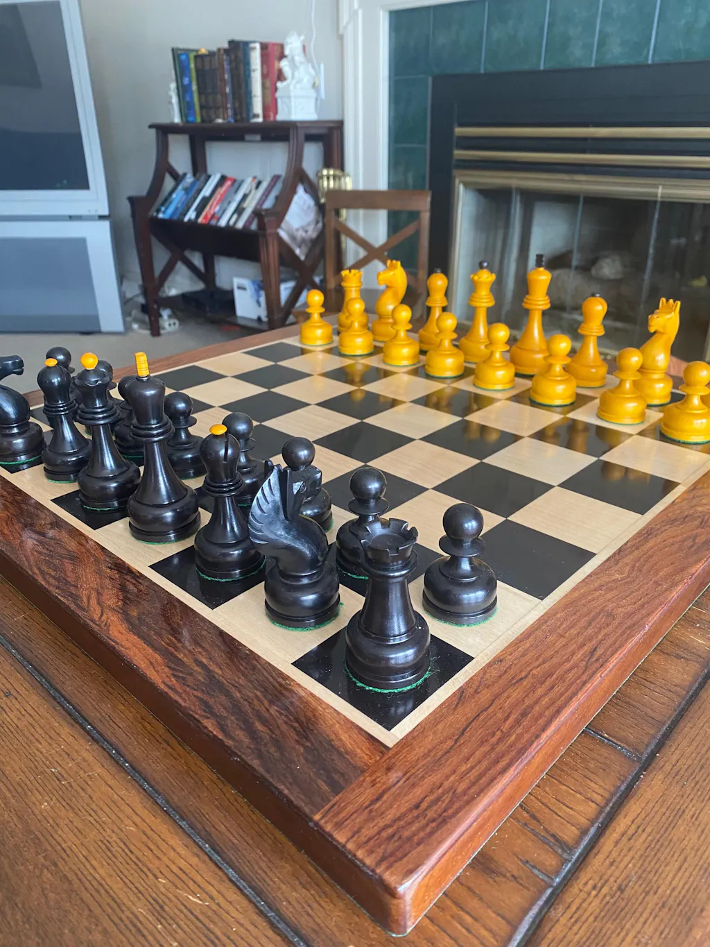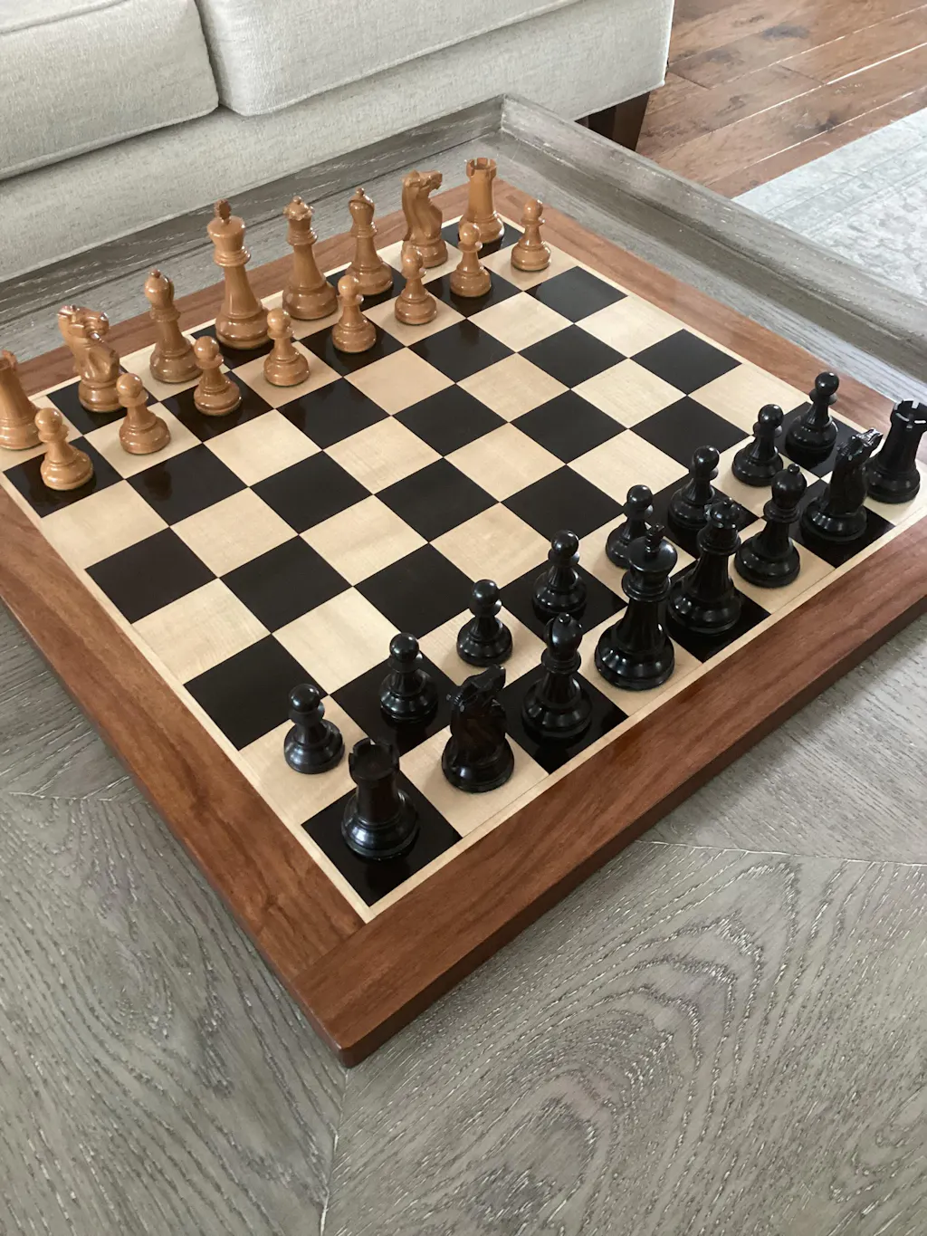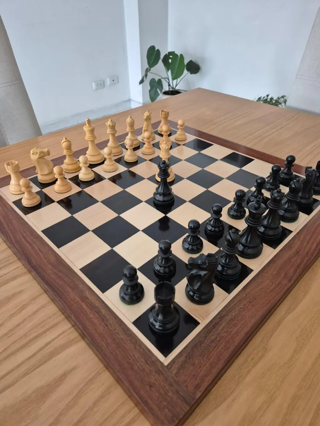Yes, perhaps the most handsome chess board that I have ever owned. This large 21” x 21” board with its 55mm squares of ebony and maple wood in perfect union, marking out the battlefield, is a beautiful sight to behold. The rich colors of black and cream framed in dark brown is, in a word, majestic.