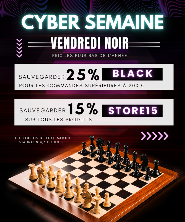Ces magnifiques jeux d'échecs ne sont pas de simples pièces sur un échiquier ; ils témoignent de votre passion pour le jeu et de votre appréciation de l'art qui préside à la création de ces ensembles exquis.De plus, pour ceux qui apprécient la simplicité, le jeu d'échecs minimaliste offre des lignes épurées et un design essentiel. La boîte de rangement pour les pièces d'échecs assure à la fois élégance et organisation, tandis que le jeu d'échecs de tournoi offre un jeu professionnel. Pour une touche de luxe, le jeu d'échecs en marbre allie esthétique et stratégie.