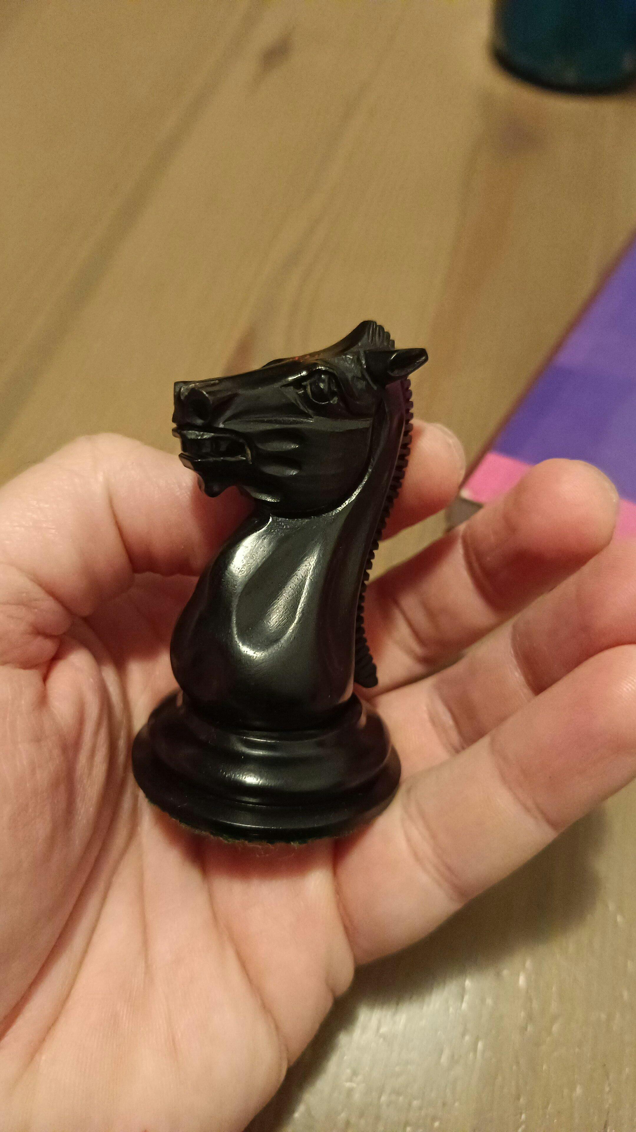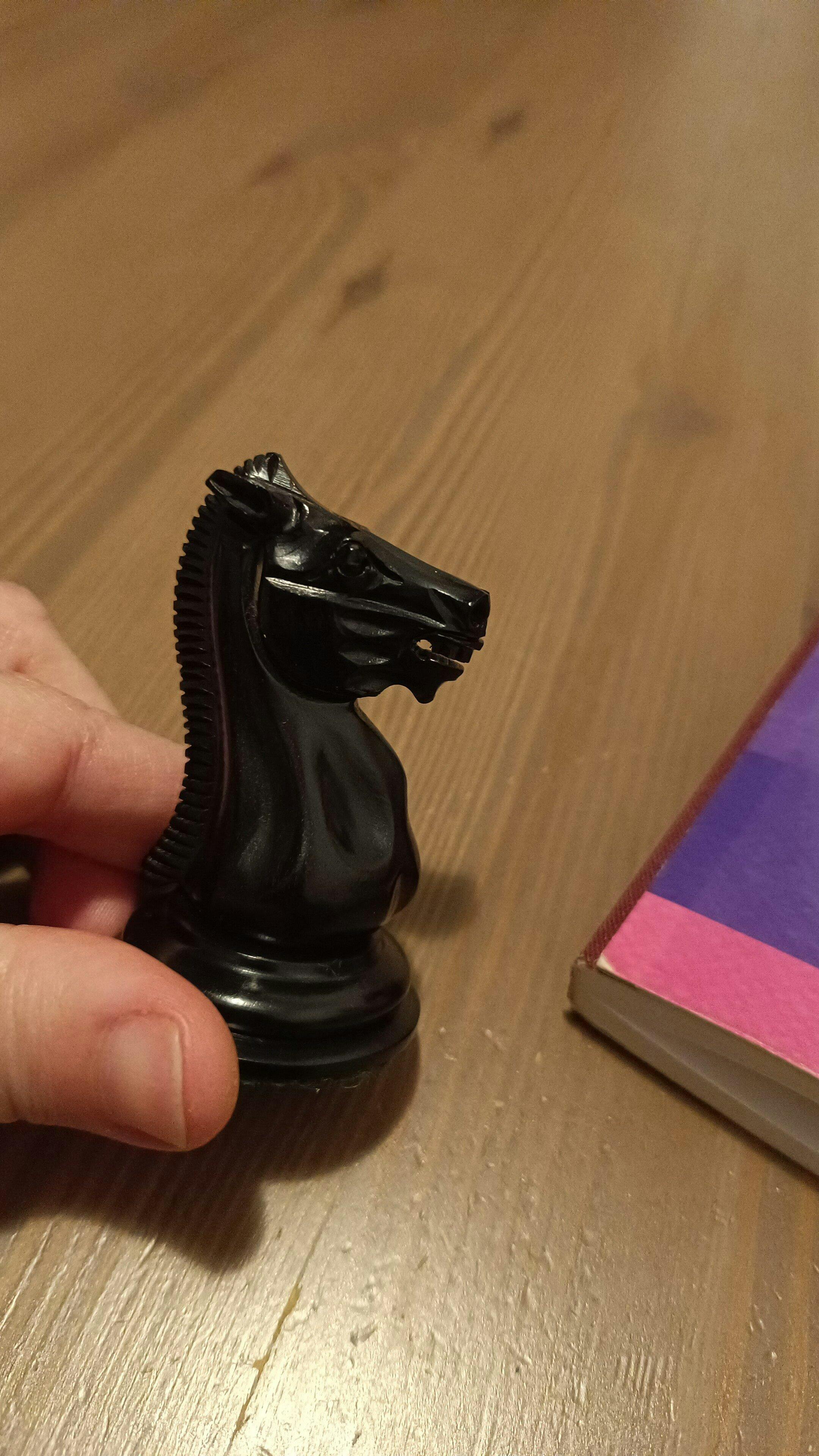 Estás piezas son únicas! , te hacen pensar en Morphy, Andersen, Staunton , La Pentier , etc . Son piezas que te invitan a tocarlas , el ébano frío , negro como la noche y con ese look brillante. El Boj envejecido , no es verdaderamente un look envejecido, más bien, es un look ámbar o amarillento, es muy particular y tiene su encanto en sí mismo, pero , no es exactamente un boj envejecido/oxidado, esto hay que tomarlo en cuenta , a mí me han gustado mucho, pero podría entender que para algunos fuese "demasiado" . El detalle del diseño es único , las bases son muy anchas , las piezas si bien son robustas a la vez son elegantes , el rey impone , los caballos son evidentemente los chicos malos de todo el conjunto, los peones son muy particulares, si bien simples , la base ancha les da un look único de sofisticación o singularidad. Tuve un pequeño problema con el Rey blanco el cual me vino manchado de rojo , y Royalchess en muy poco tiempo me repusieron la pieza , la calidad de atención es impecable muy diferente a otras páginas. En resumen unas verdaderas joyas si te gustan las piezas clásicas con un toque particular.