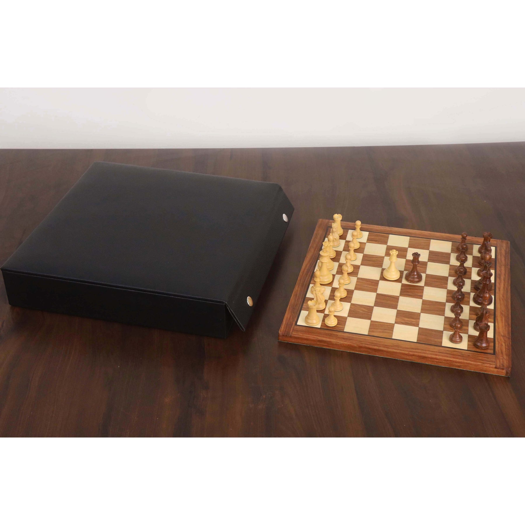 The sleek leatherette storage box safely holds both the board and the pieces together, keeping everything organized and travel-ready.