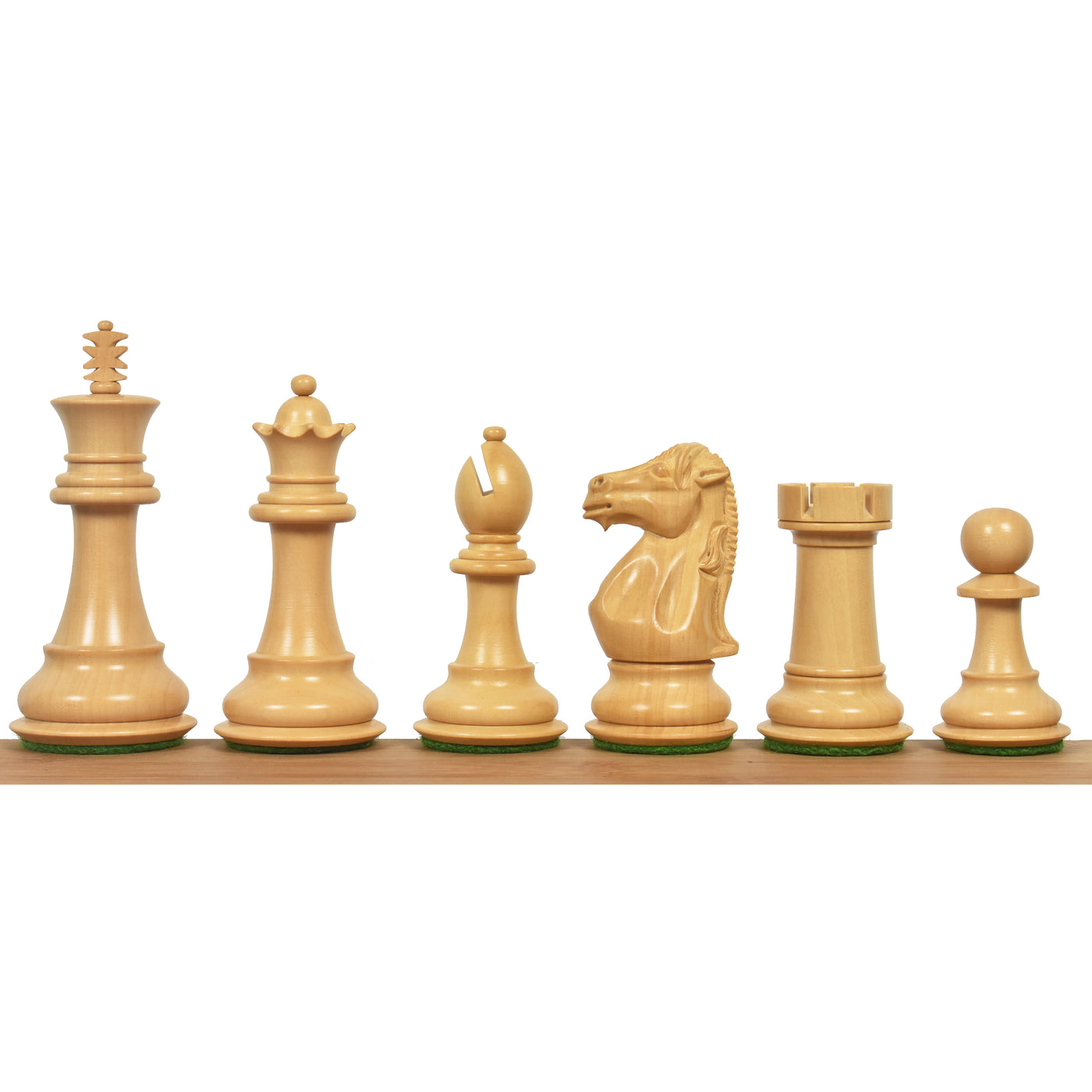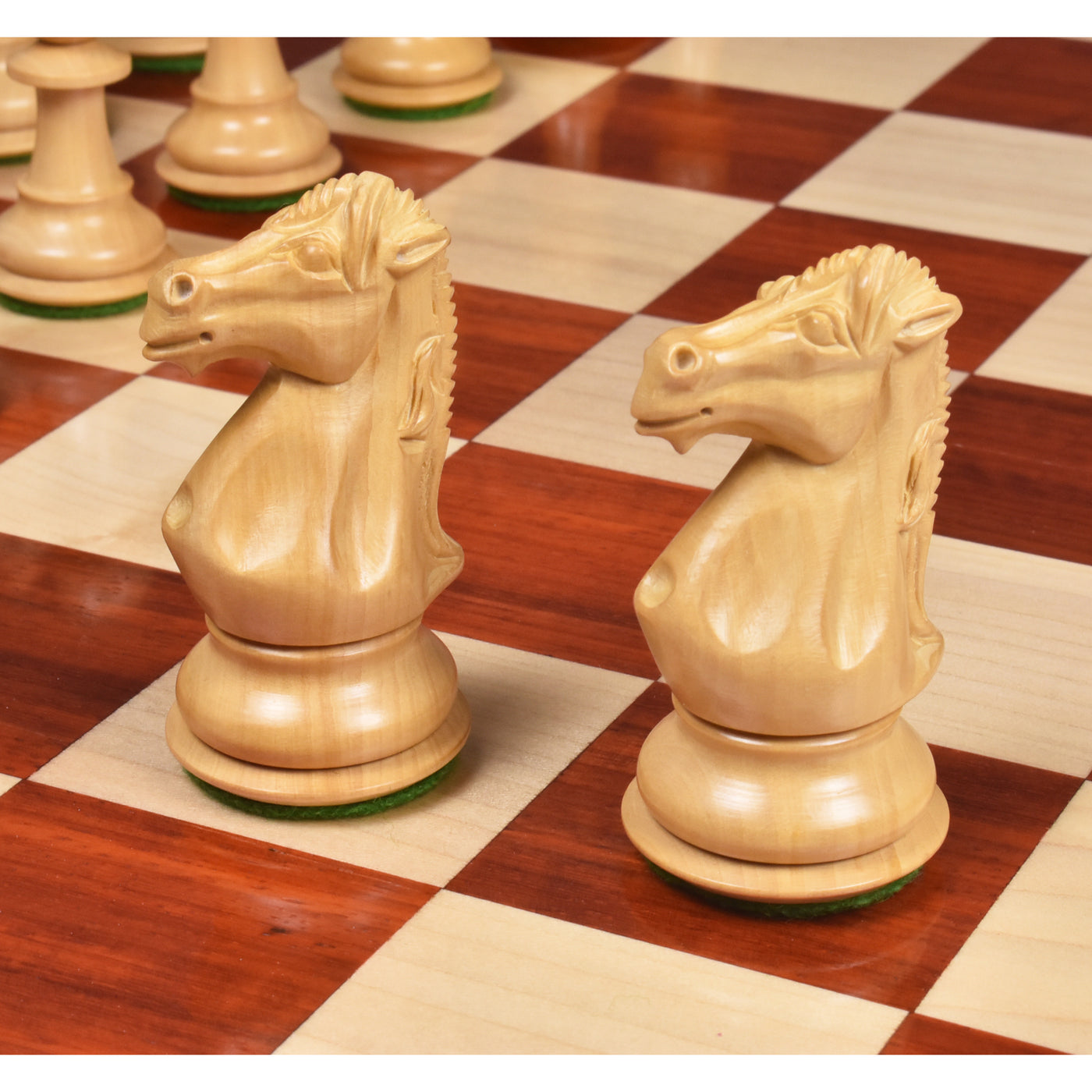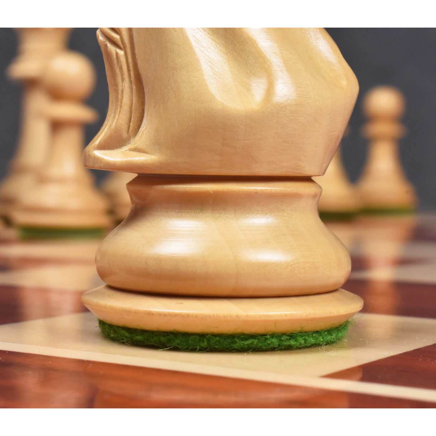 Royal Knight Staunton is an exquisite design of chessmen. The knight of this design has been carved from a single block of wood. Collectors will be able to see a consistent grain of wood from the upper body to the base. Triple weighting the set increases the heft and feel good factor of the pieces and a very good choice for everyday play.