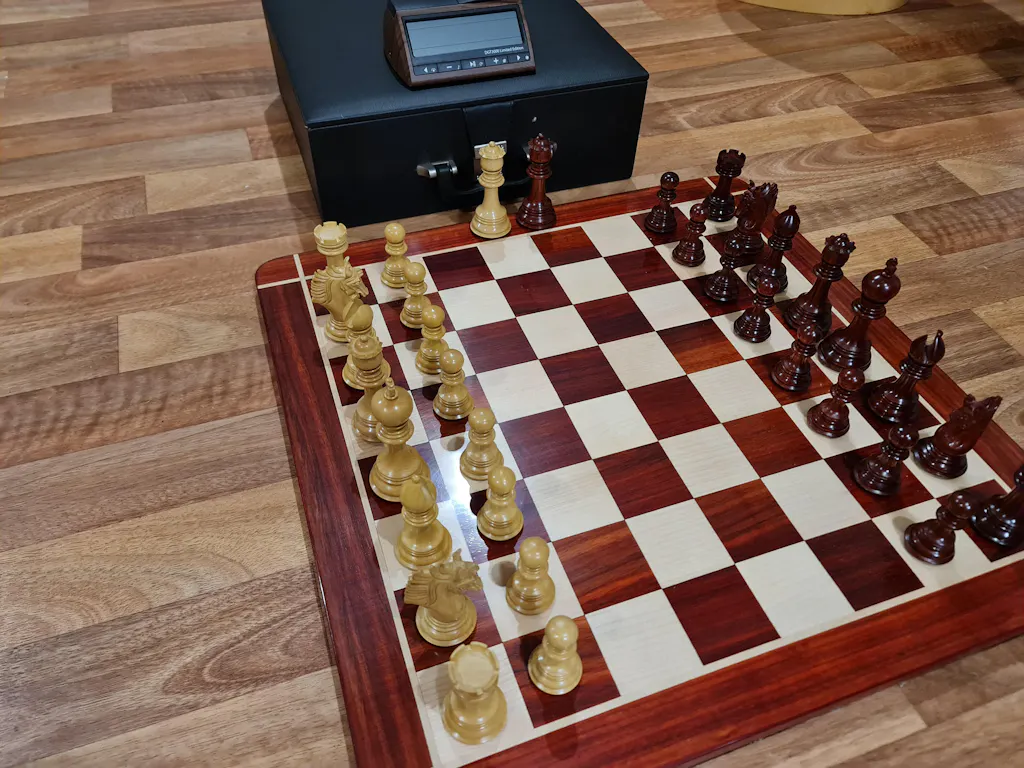 Erwin Pitsch I am very happy with my 58cm Rosewood board, 4.6 inch triple weighted set of figures and box. The feeling of playing is amazing, and even playing via app is no problem, e.g. lichess voice control, one does not need an electronic board at all. Buy a proper traditional board rather than some electronic set which stops working after 2 years.