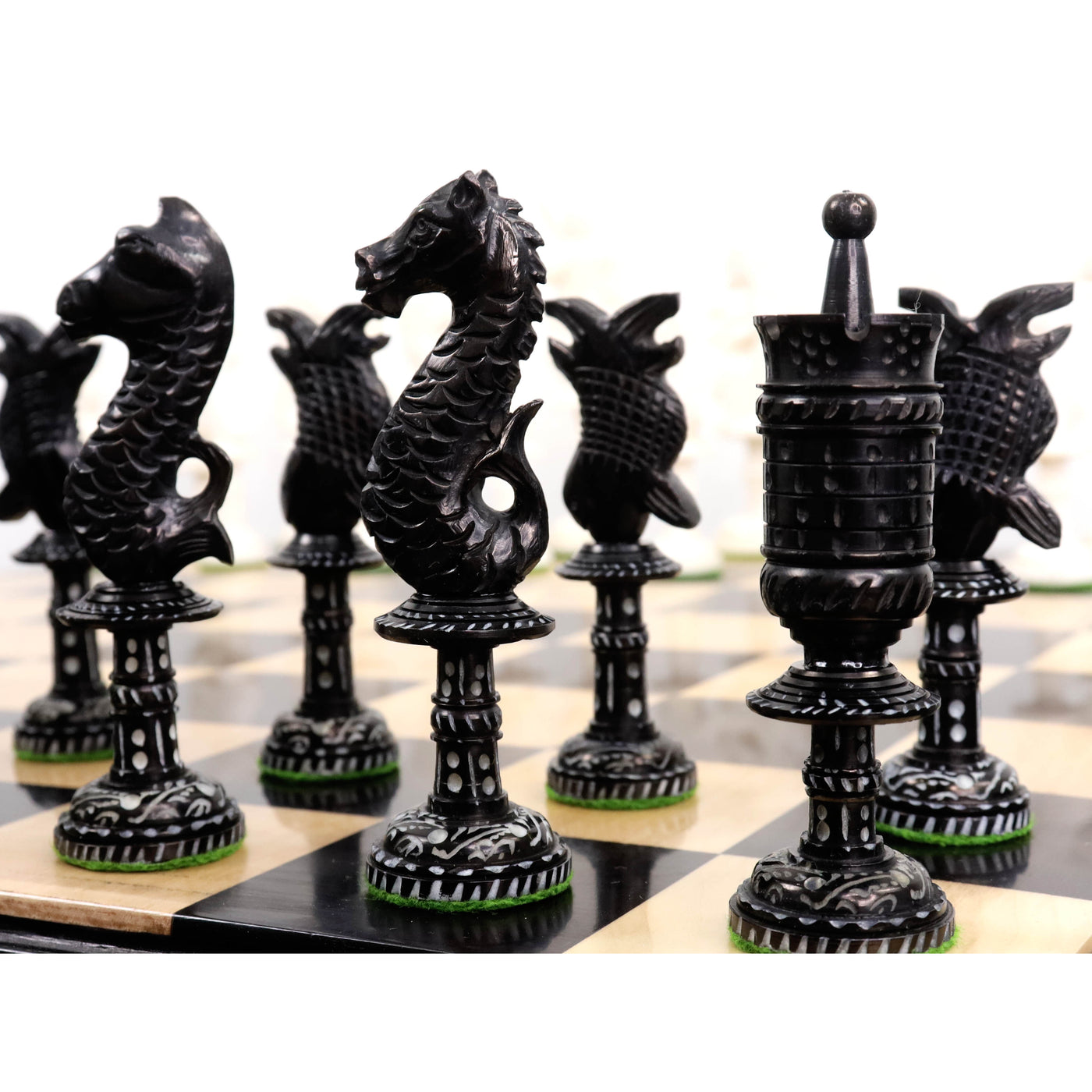 Camel Bone which is the primary substrate used in making these chess pieces is an excellent material due to its carving properties and when finished, it gives off a beautiful luster and ranks very high on collectability.