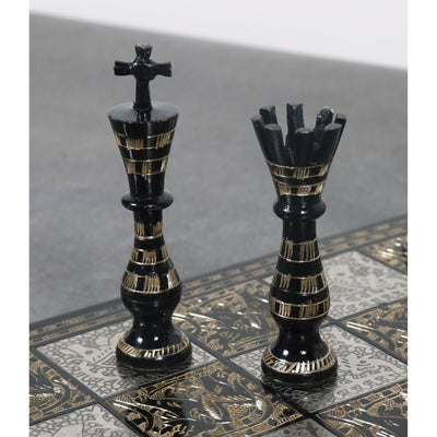 Introducing the Sovereign Series Brass Metal Luxury Chess Set, a stunning 14" masterpiece inspired by a Queenโ€™s coronet and her regal army. This set epitomizes elegance, featuring chess pieces with a sleek black and silver finish, adorned with detailed gold and silver hand carvings. The chessboard itself is a work of art, with unique carvings of Asian elephants adding an extra touch of sophistication.